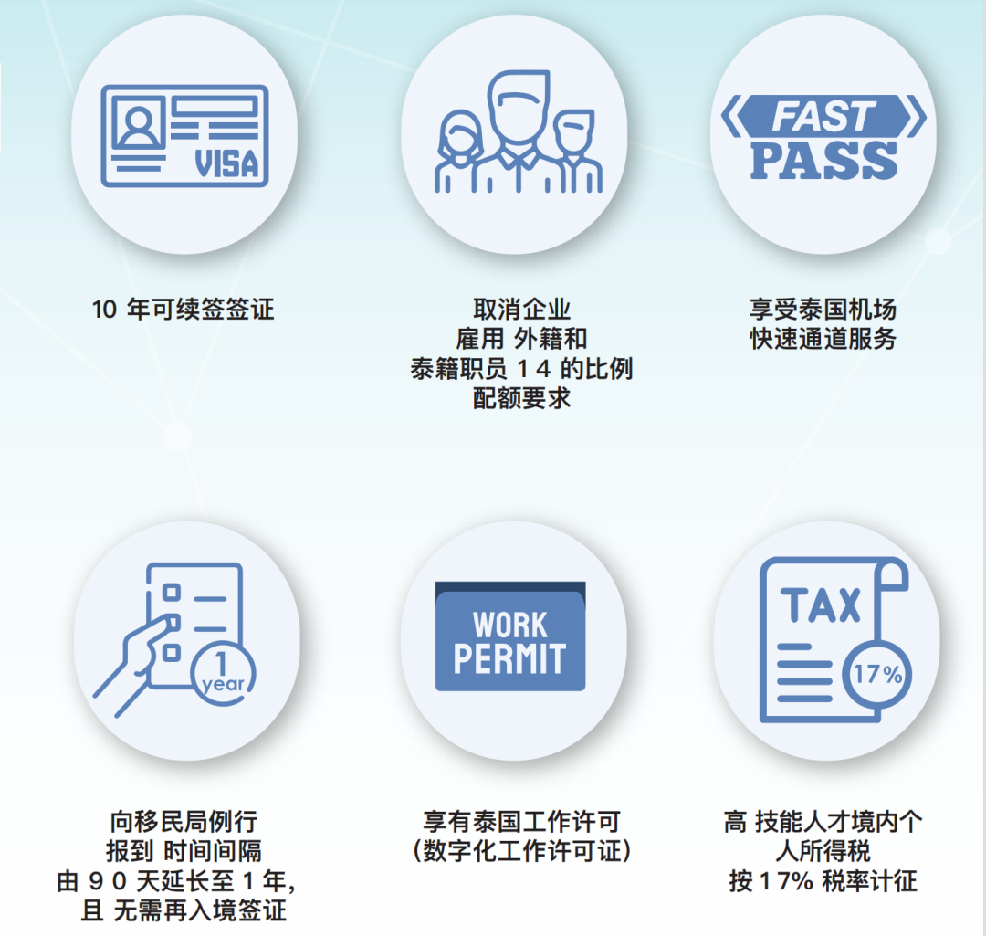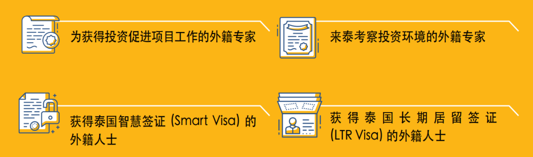 申请者将获得6个月至4年在泰居留和工作的权利,并享受如下优惠权益: