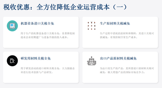 1. 关税减免:机器设备进口关税全免;生产所需原材料、物料进口关税减免;研发用材料进口关税全免;