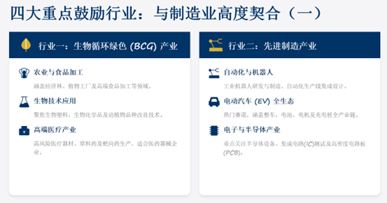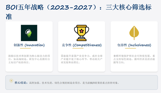 BOI 2023-2027 年五年战略中,核心围绕三大愿景筛选项目,符合以下方向的制造业项目更易获得优惠: